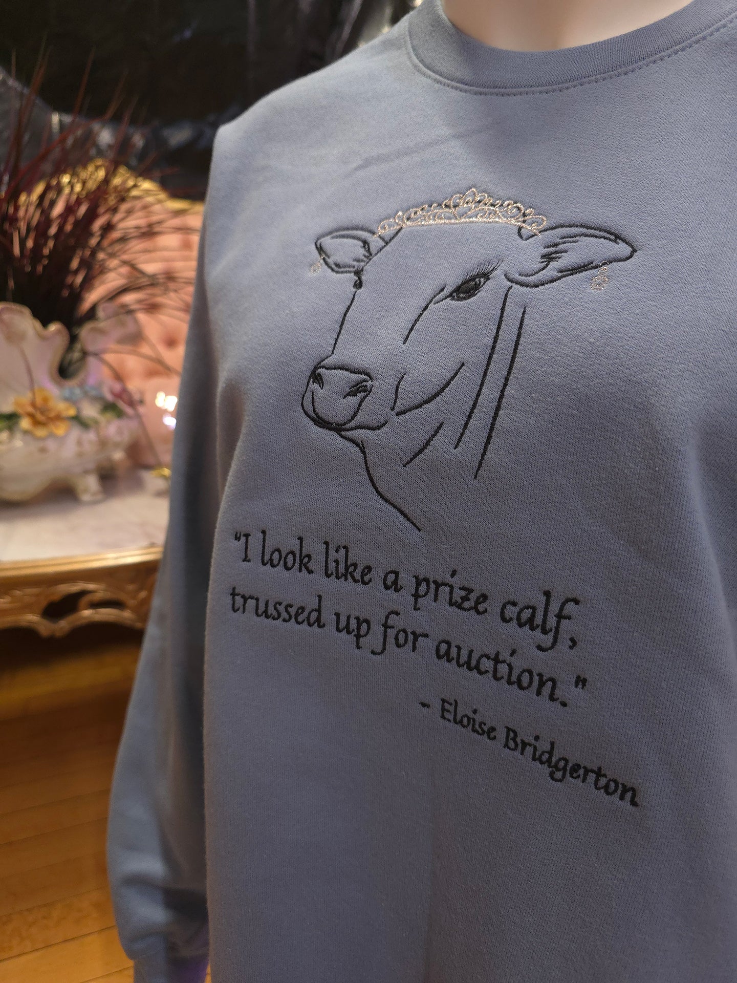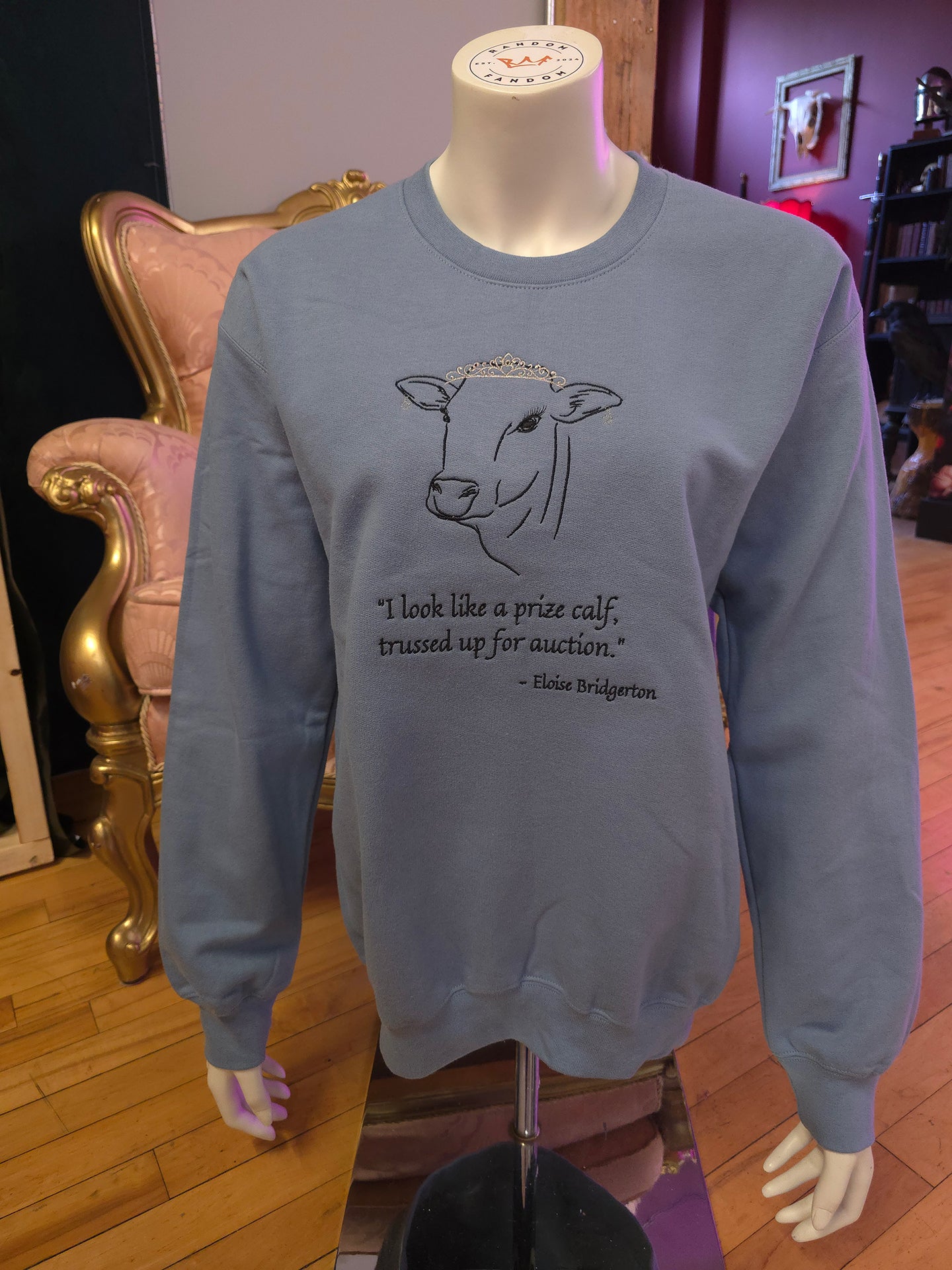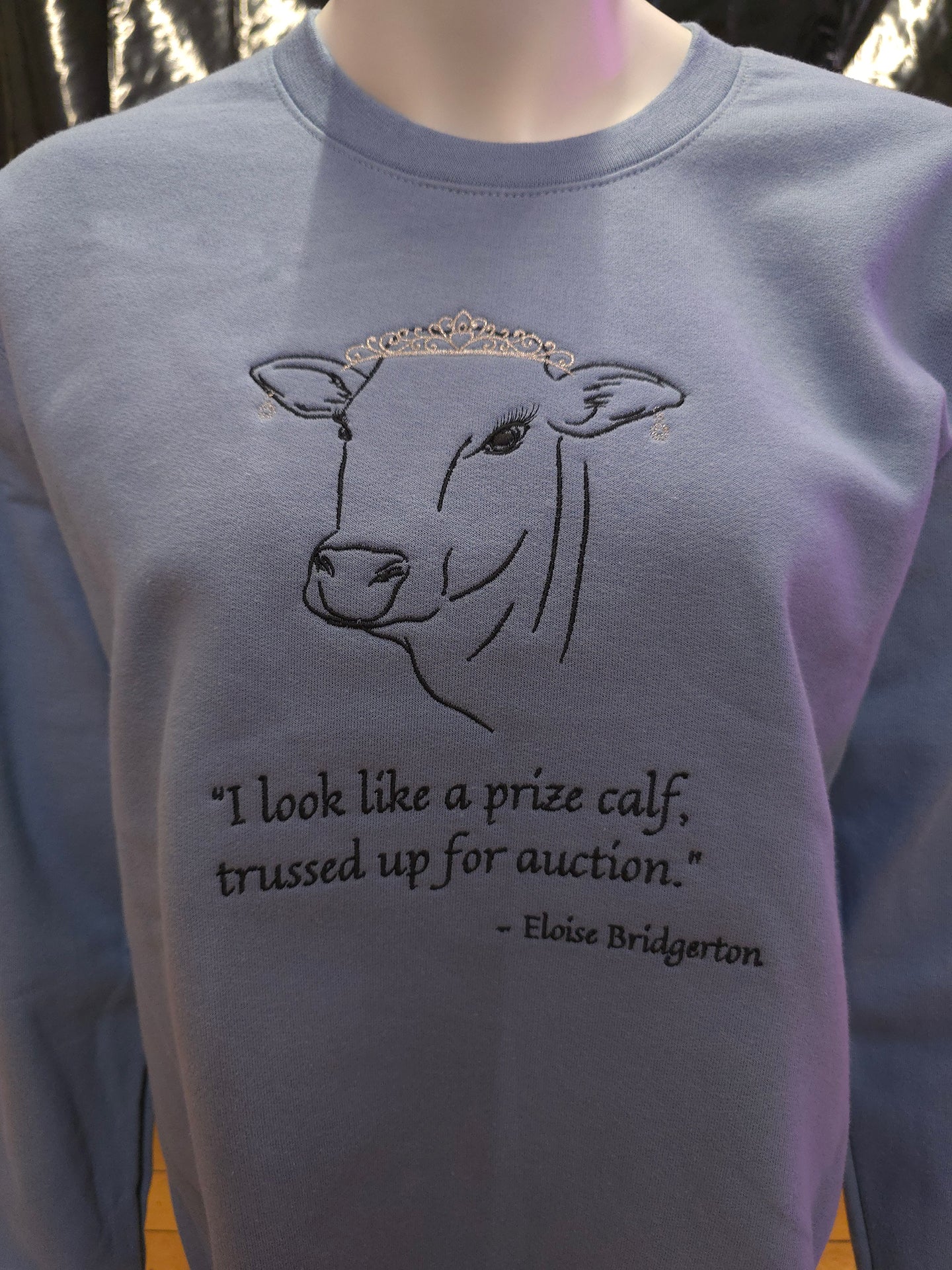 This stone blue crewneck features one of her iconic quotes beneath the image of an adorable cow with long lashes, wearing a shiny silver tiara and silver earrings.